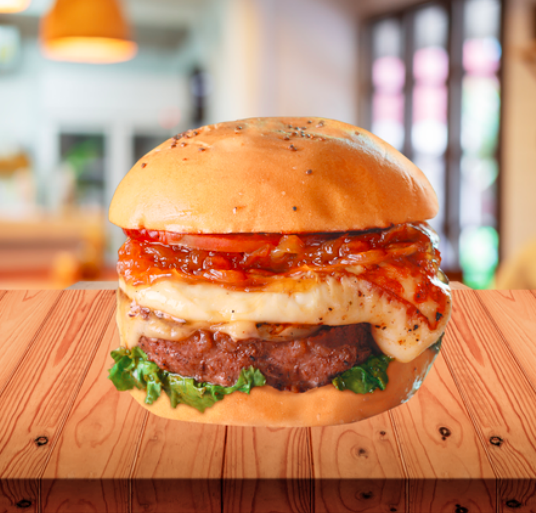 Pan de chía, 150 g de carne de res, cebolla caramelizada, queso holandés, queso costeño, lechuga crespa, salsa mayonesa, y salsa BBQ de la casa.