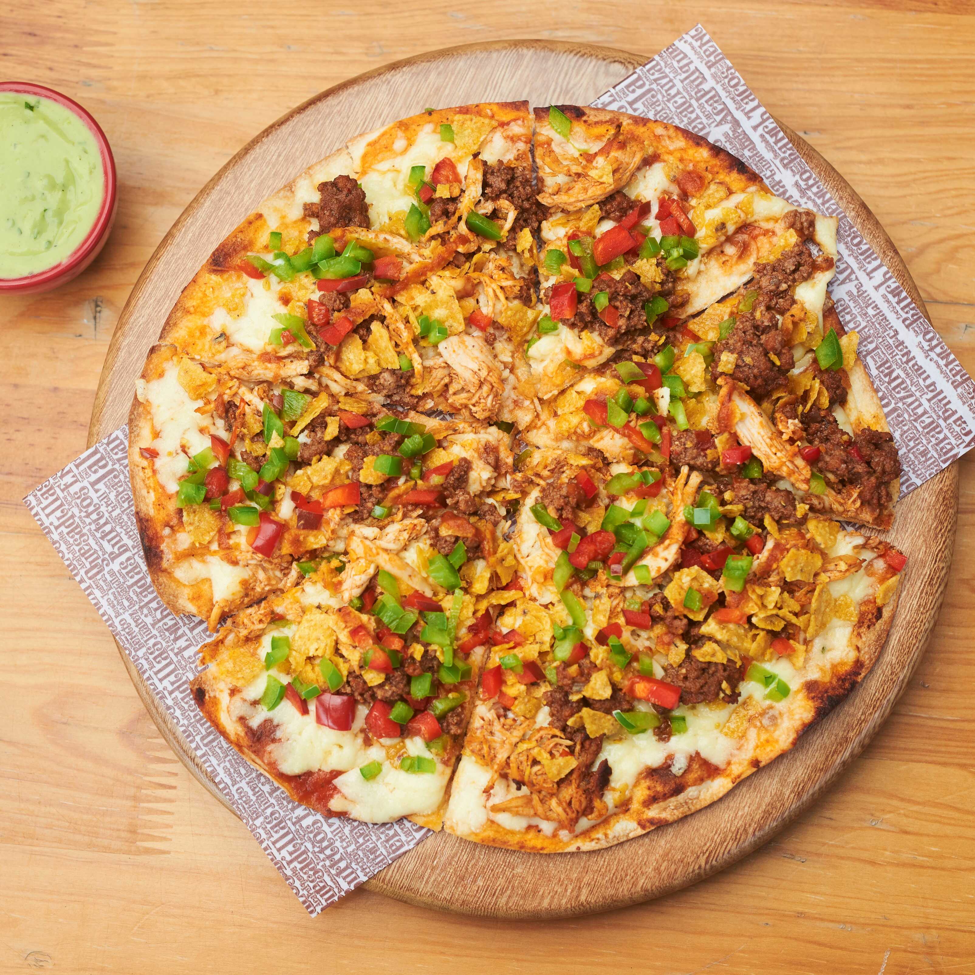 Pizza personal 25 cm (8 porciones) a base de tortilla con cerdo a la parrilla en trozos con pizza caramelizada, cilantro, cebolla, salsa ranchera y queso fundido + Gaseosa 250ml