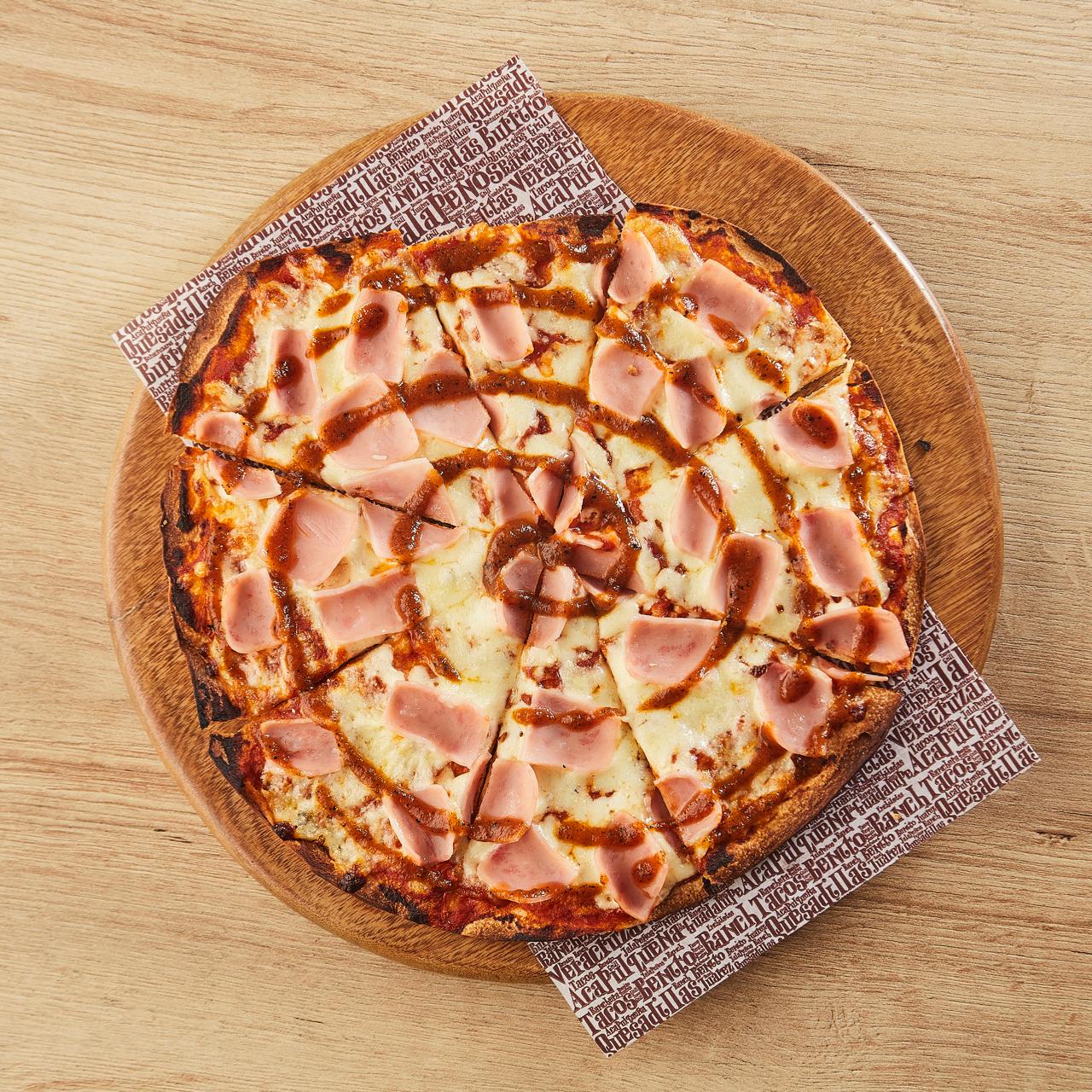 Nuestra pizza de jamón, salsa ranchera y el queso fundido.