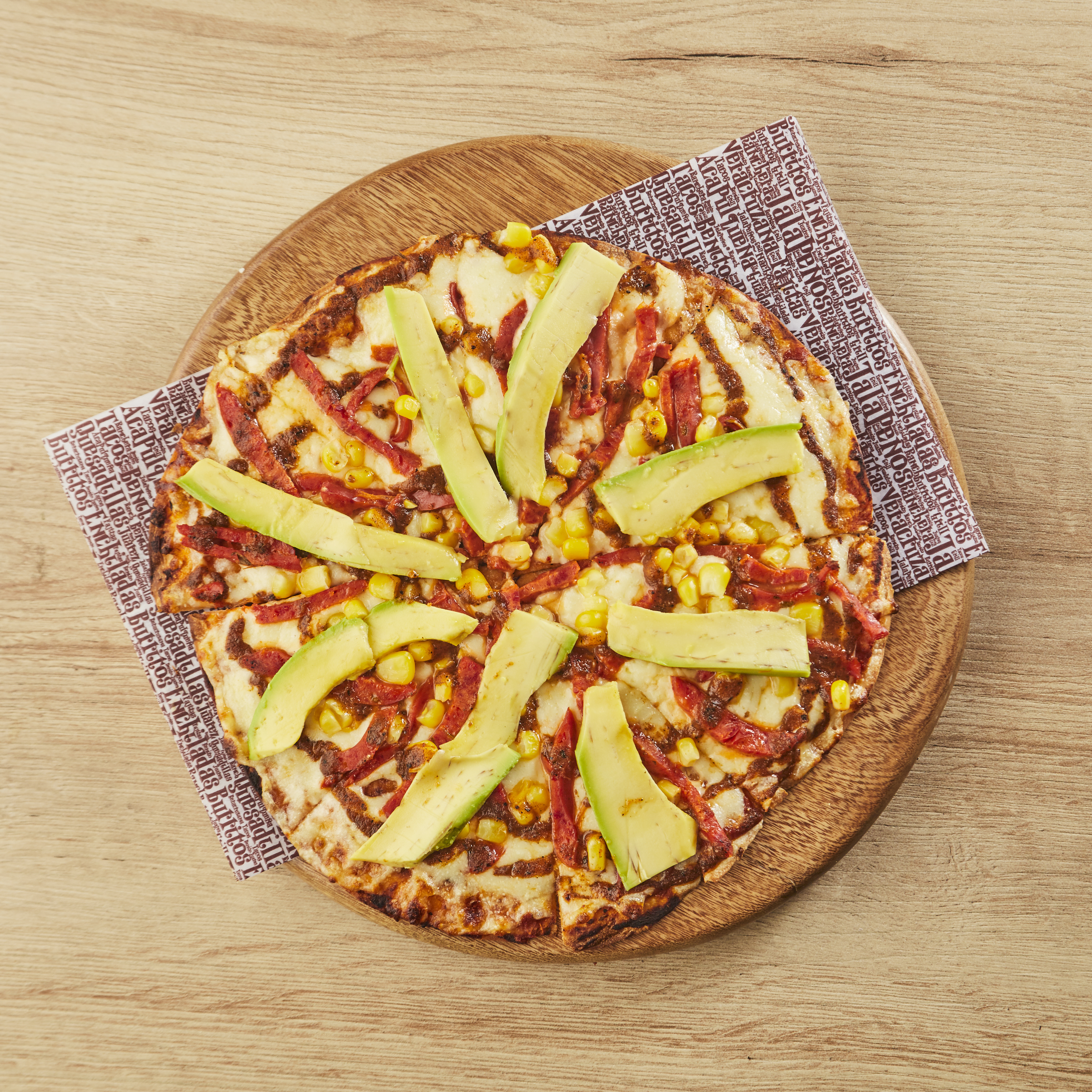 Exquisitas láminas de aguacate, chorizo, maíz, salsa ranchera y el queso fundido.