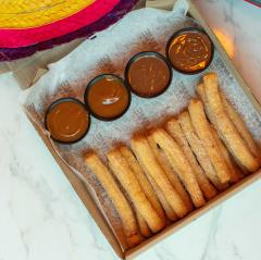 16 Bastones de harina freídos, espolvoreados con azúcar y canela, bañados con nutella o arequipe.