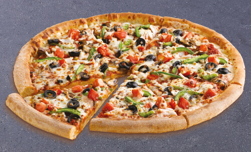 Masa de harina, tomate, ajo, pimentón, cebolla, champiñones, aceitunas y queso mozzarella.