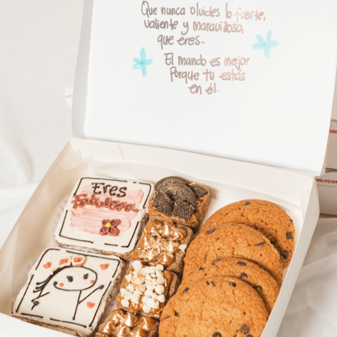 Box edición especial para nuestros cumpleaños favoritos, contiene: 4 galletas mediana de avena con chips de chocolate, 4 mini brownies + toppings ,2 brownies estándar de 8x8cm con diseño de cumpleaños.