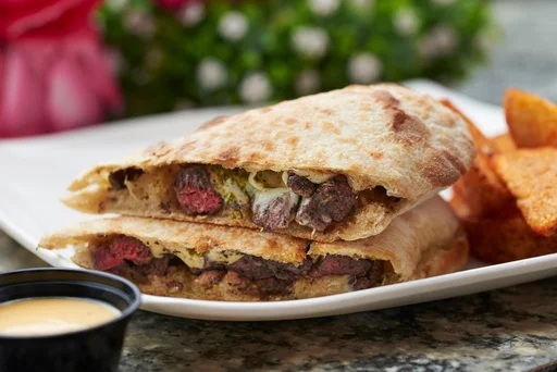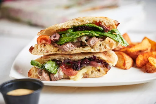 Sándwich lomo en reducción de vino tinto, queso mozzarella, queso azul, cebolla caramelizada, tocineta y salsa de la casa.