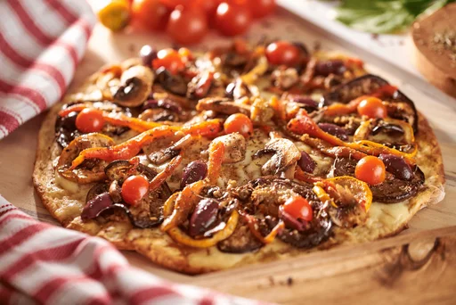 Pizza personal. Ingredientes: crema de alcachofa, mozzarella, pimentones asados, zucchini y berenjena al horno, champiñones frescos, aceitunas marinadas en aceite de oliva y tomates cherry.