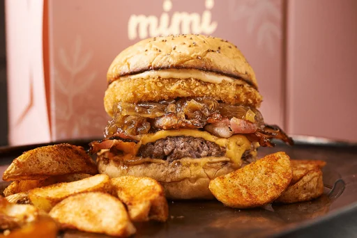 Hamburguesa carne angus de 125 g, mozzarella de búfala, cebolla crispy, confitura de pimentón y salsa de la casa, acompañada con casquitos de papa crocante..