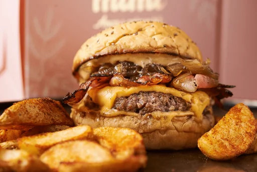 Hamburguesa carne angus de 125 g, queso americano, tocineta crocante, cebolla caramelizada, cebolla crunchy y salsa chingona, acompañada con casquitos de papa crocante.