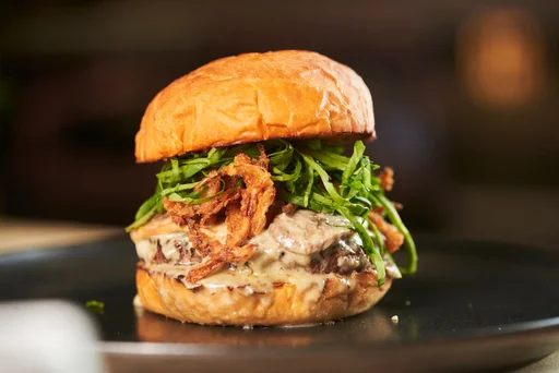 Hamburguesa carne angus de 150 g, salsa de queso azul, champiñones, rúgula fina, lluvia de tocineta crocante, cebolla crunchy en finas tiras, acompañada con casquitos de papa crocante.