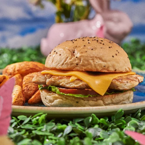 Hamburguesa filete de pollo, queso americano, tomate fresco, lechuga y salsa de la casa, acompañada con casquitos de papa crocante.