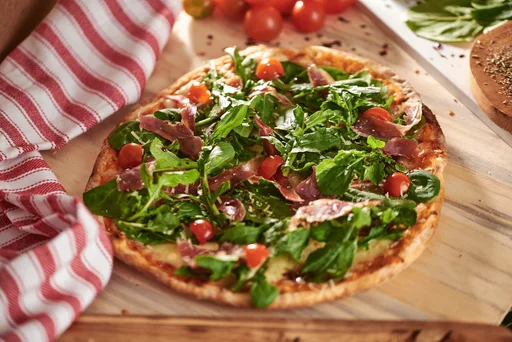Pizza personal. Ingredientes: pomodoro de la casa, queso mozzarella, prosciutto, rúgula, tomate cherry y queso parmesano.