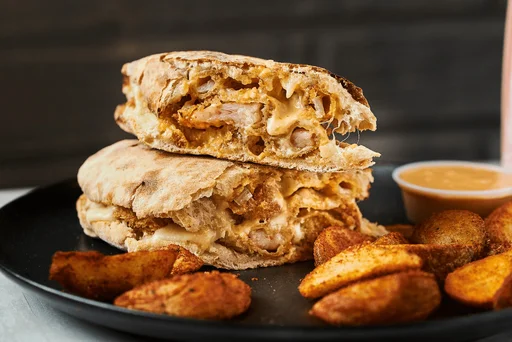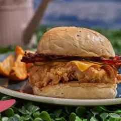 Hamburguesa pollo crispy, queso americano, tocineta crujiente, pepinillos y salsa de la casa, acompañado con casquitos de papa crocante.