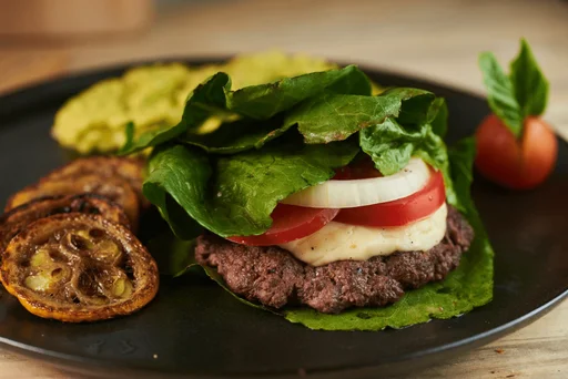 Hamburguesa carne angus de 125 g, queso suizo madurado, tomate, cebolla y envuelta en lechuga, acompañada con zucchini y guacamole.