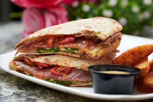 Sándwich prosciutto, queso mozzarella, rúgula fresca y tomate cherry en reducción de aceto balsámico.