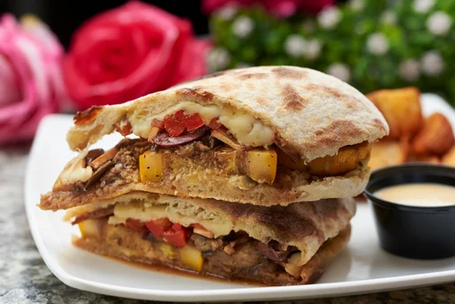 Sándwich crema de alcachofa, queso mozzarella, pimentones asados, zucchini y berenjena al horno, champiñones frescos, aceitunas marinadas en aceite de oliva y tomate cherry.