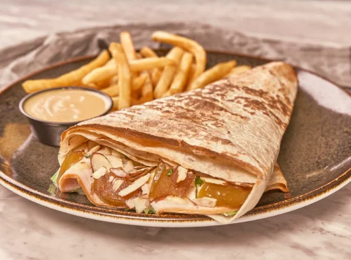 Combo Sándwich wrap con pan sabaneta, pechuga de pavo, mozzarella, americano y holandés, manzana caramelizada, rúgula, almendras fileteadas, hierbabuena y papas a la francesa.