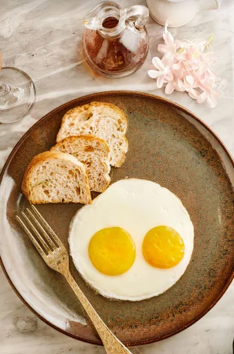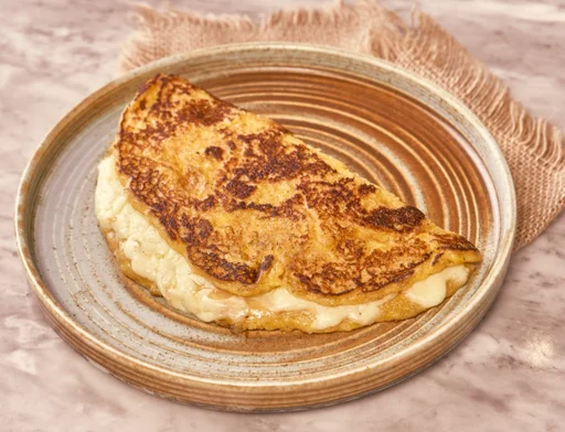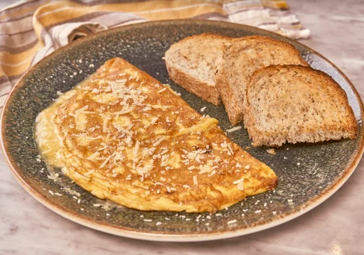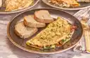 Huevo en omelette relleno de queso suizo, mozzarella y americano, acompañado de pan de la casa recién horneado.