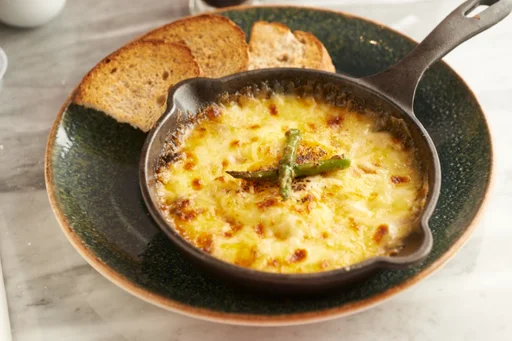 Cacerola de huevo al horno josper, puerros, champiñones, queso mozzarella, espárragos, y chorreado de pomodoro con tomates rostizados, acompañado de pan de la casa recién horneado.