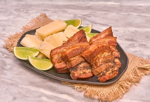 Combo Picada de 300 g de chicharrón marinado, acompañado de yuca, papa casco o papa amarilla (elige tu acompañante) y suero.