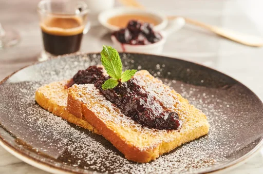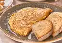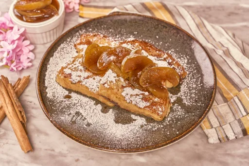 Tostadas de pan brioche, cubierta de manzanas caramelizadas en miel y canela.