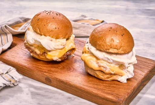 Dos huevos pochados dentro de pan de papa, carne angus, queso americano, alioli ahumado con tocineta.