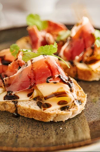 Tostada de pan de masa madre, queso suizo, prosciutto y germinado de rúgula.