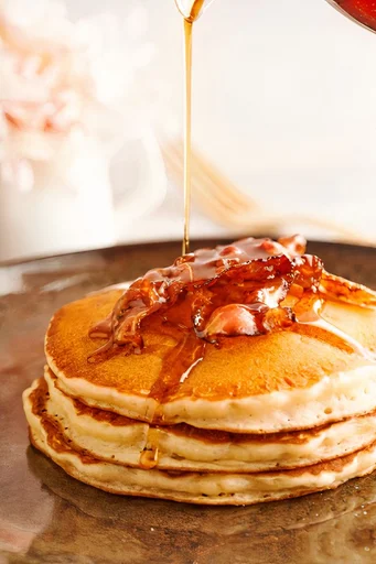 Nuestra receta tradicional de pancakes, acompañado de miel de maple y tocineta caramelizada.