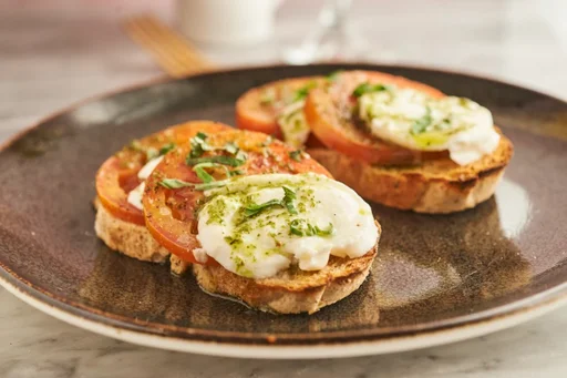 Tostada de pan de masa madre con tomates rostizados y mozzarella de búfala.