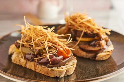 Tostada de pan de masa madre, crema de alcachofa, berenjena, pimentón y zucchini asados, con aceitunas kalamata y cebolla puerro.
