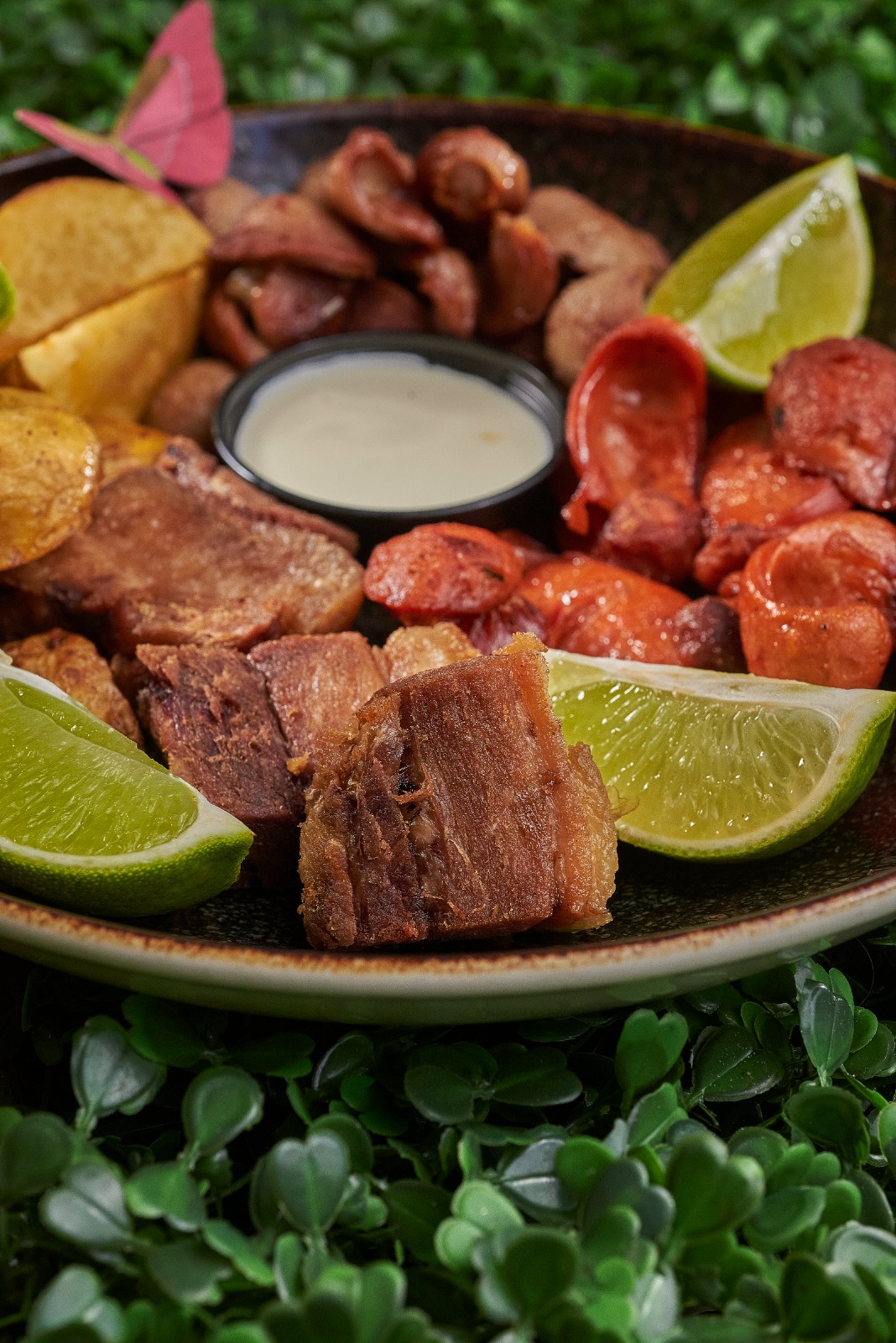 Picada con chorizo de res, chorizo de cerdo, chicharrón y papa amarilla acompañada de suero.