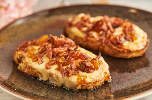 Tostada de pan de masa madre, tocineta crocante, queso mozzarella y piña caramelizada.