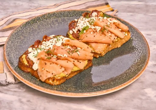 Huevos pochados sobre un english toast, queso feta, tomate confitado, salmón ahumado y ajonjolí, acompañado de pan de la casa recién horneado.