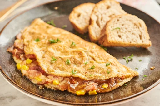 Huevo en omelette con cebolla caramelizada, queso holandés, maíz tierno y tocineta, acompañado de pan de la casa recién horneado.