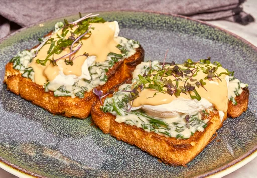 Huevos pochados dentro de un pan brioche con crema de espinaca fresca, salsa holandesa y germinados.