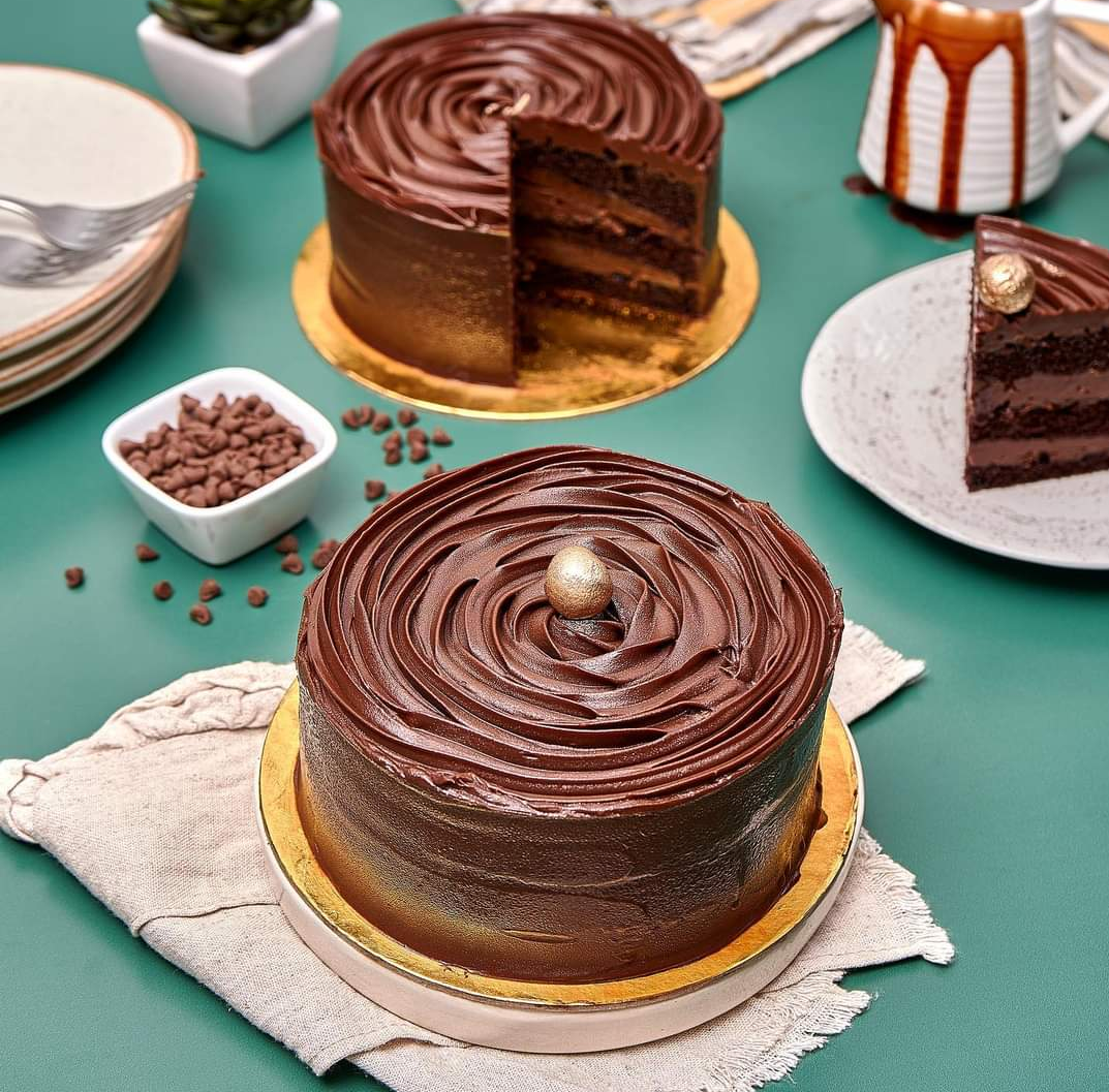 Pudin húmedo de trufa de chocolate rellena y cubierta con capas de chocolate trufado.