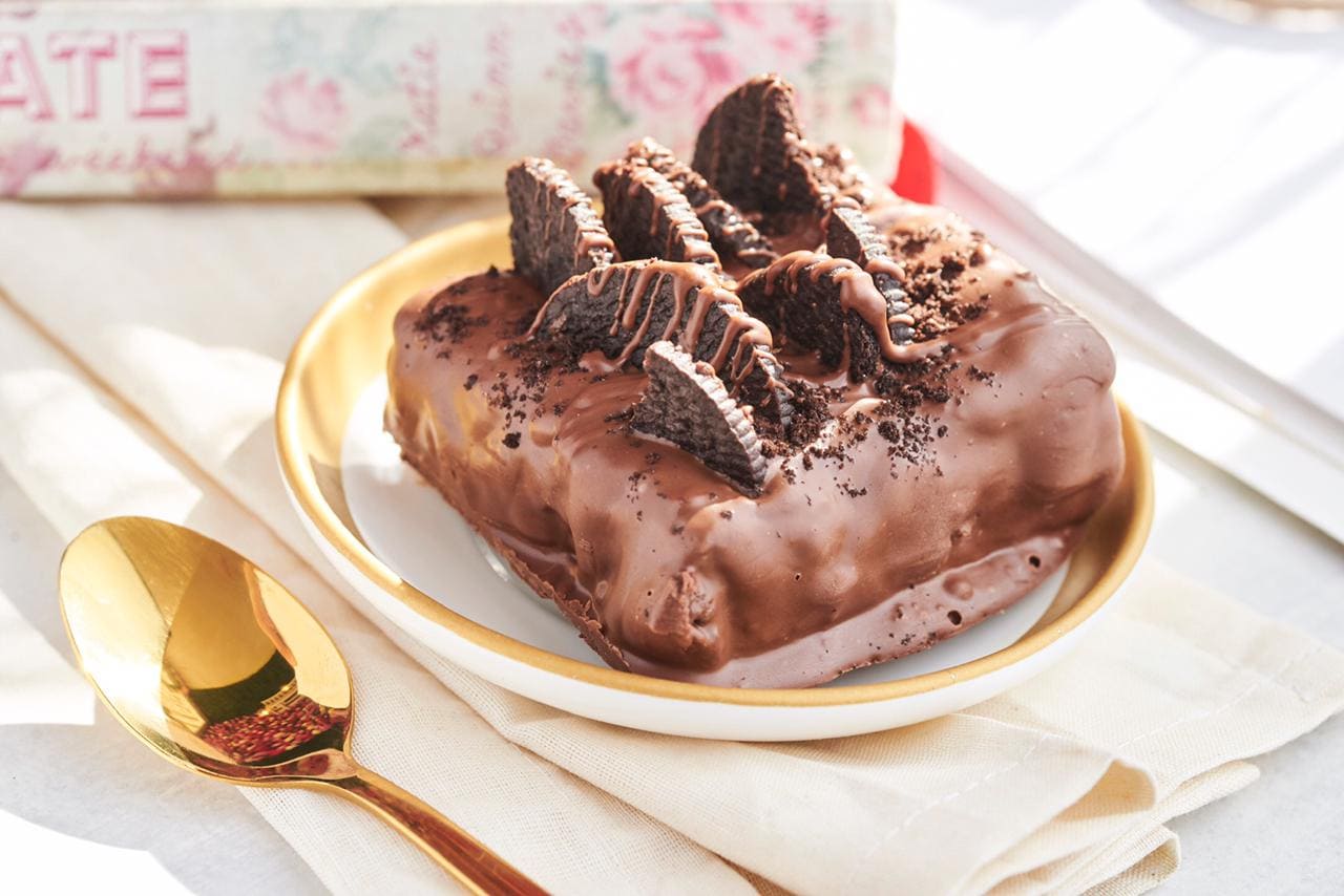 Pudín húmedo de trufa de chocolate rellena y cubierta con capas de chocolate.