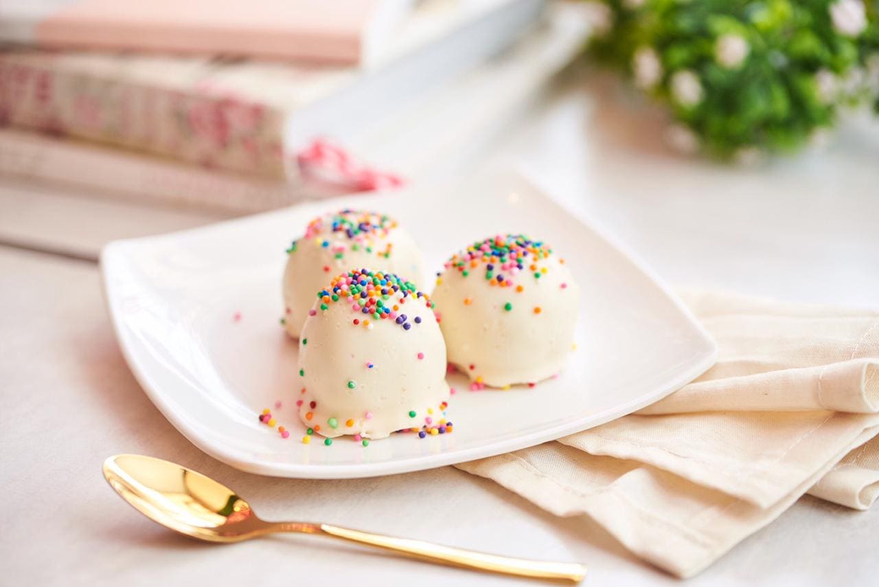Trufa de masa de galleta rellena de sprinkles bañada en chocolate blanco