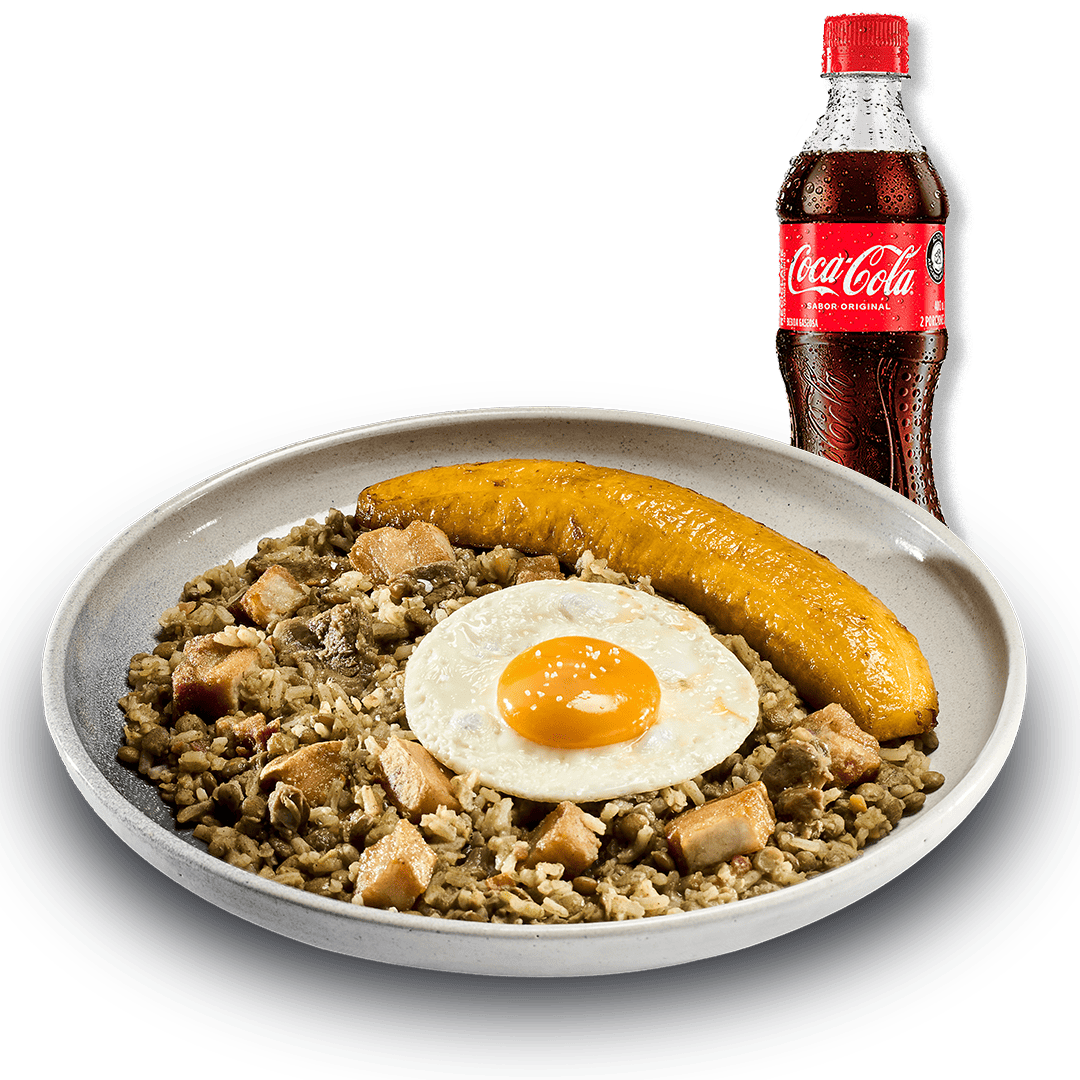 Calentado con mezcla de arroz, frijol, carne de res, chicharron, arepa de pincho, tajada de plátano y huevo frito + Coca Cola 400 Ml.