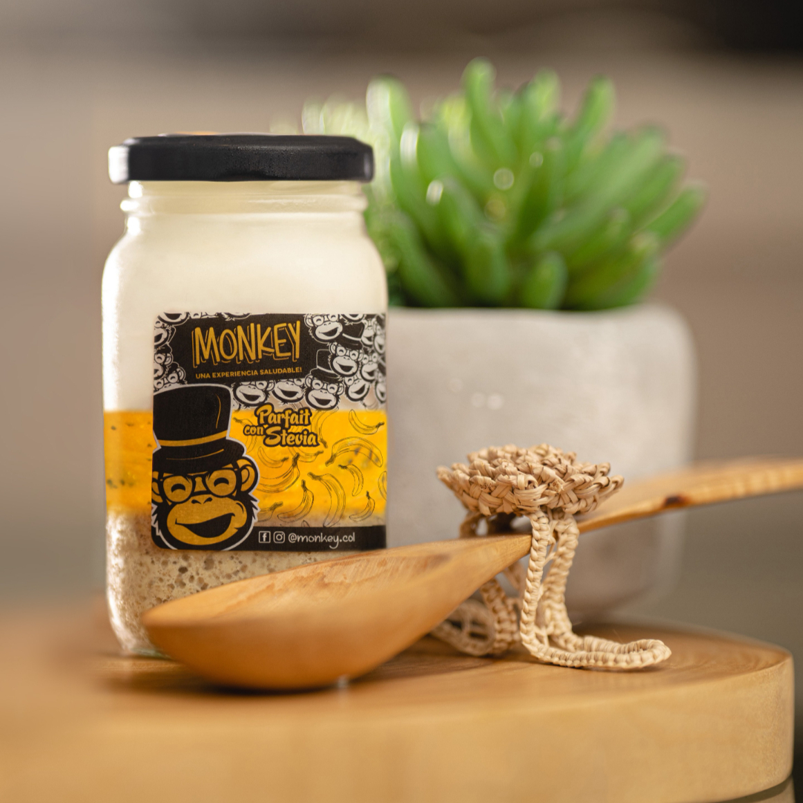 Yogurt artesanal sin químicos, endulzado con miel, trozos de nuestra tradicional torta de banano y avena.