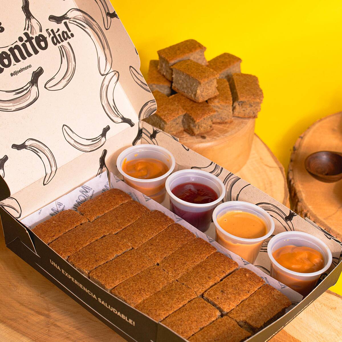 Caja de 16 bites de banano y cacao, con 4 toppings distintos. arequipe, mermelada de arándanos, syrup de chocolate, syrup de fresa. todos con stevia.