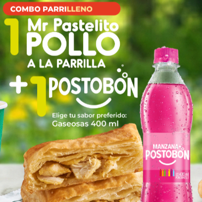 1 mr pastelito pollo parrilla + 1 gaseosa postobon sabor surtido ( disponibilidad del punto de venta )