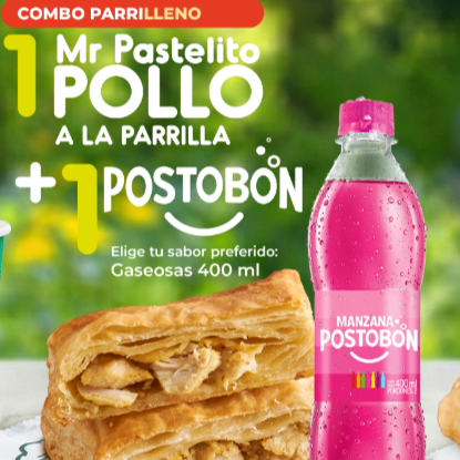 1 mr pastelito pollo parrilla + 1 gaseosa postobon sabor surtido ( disponibilidad del punto de venta )