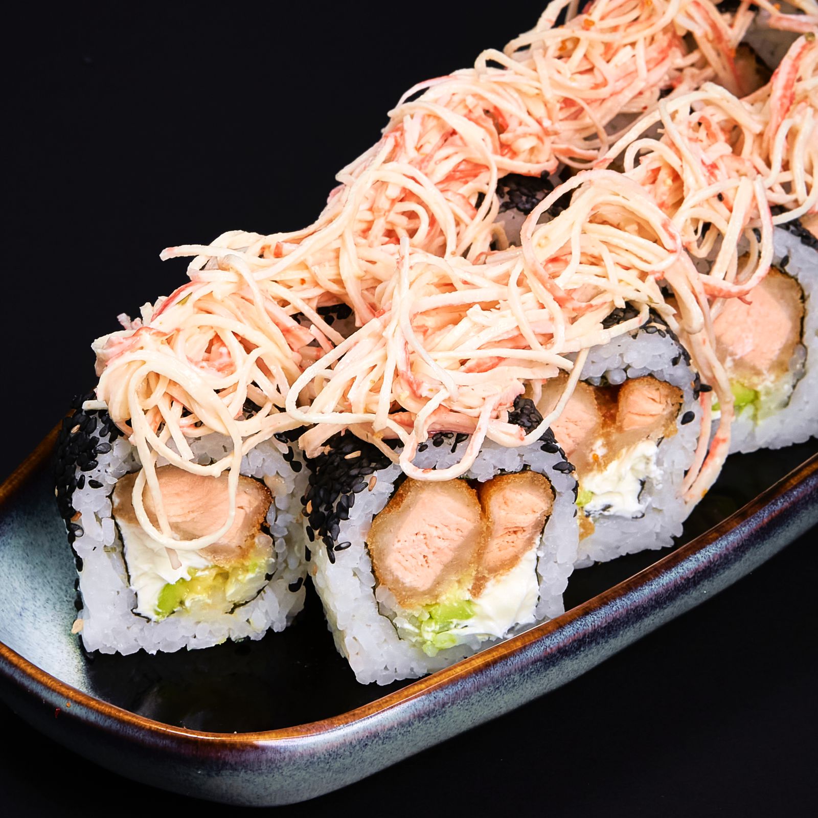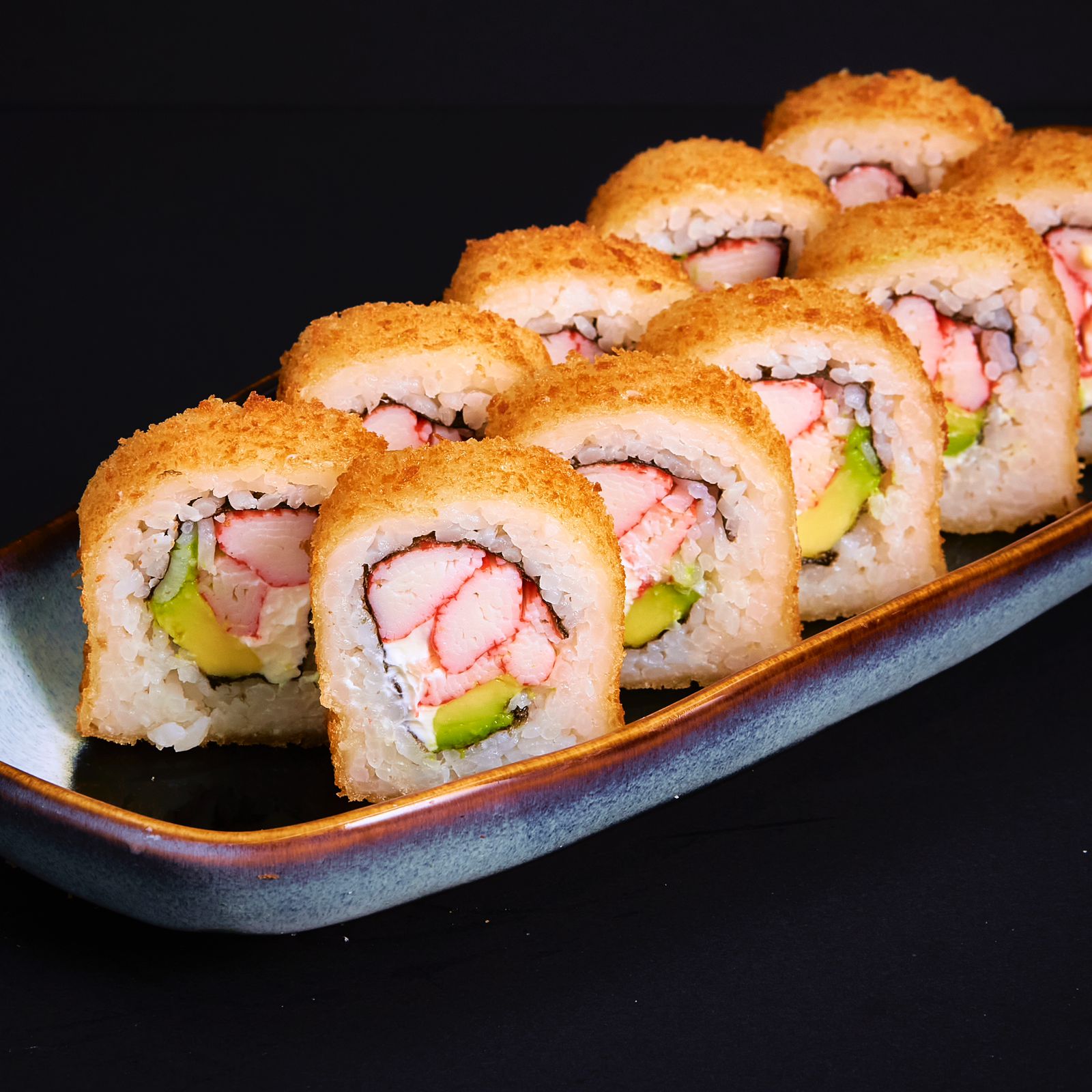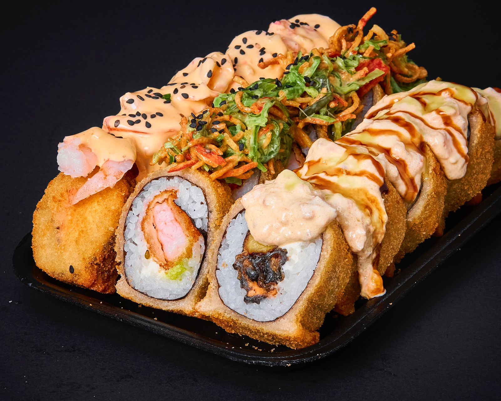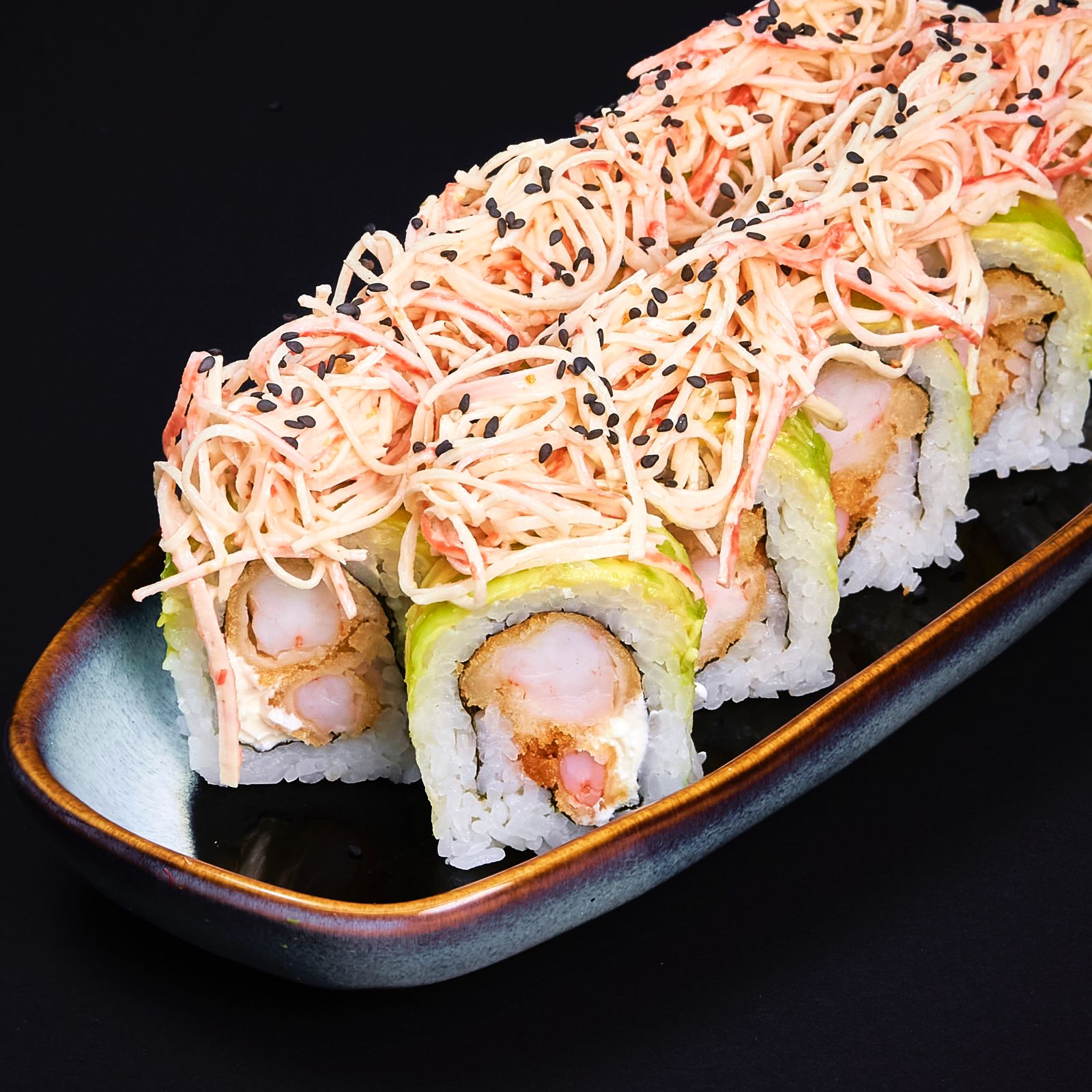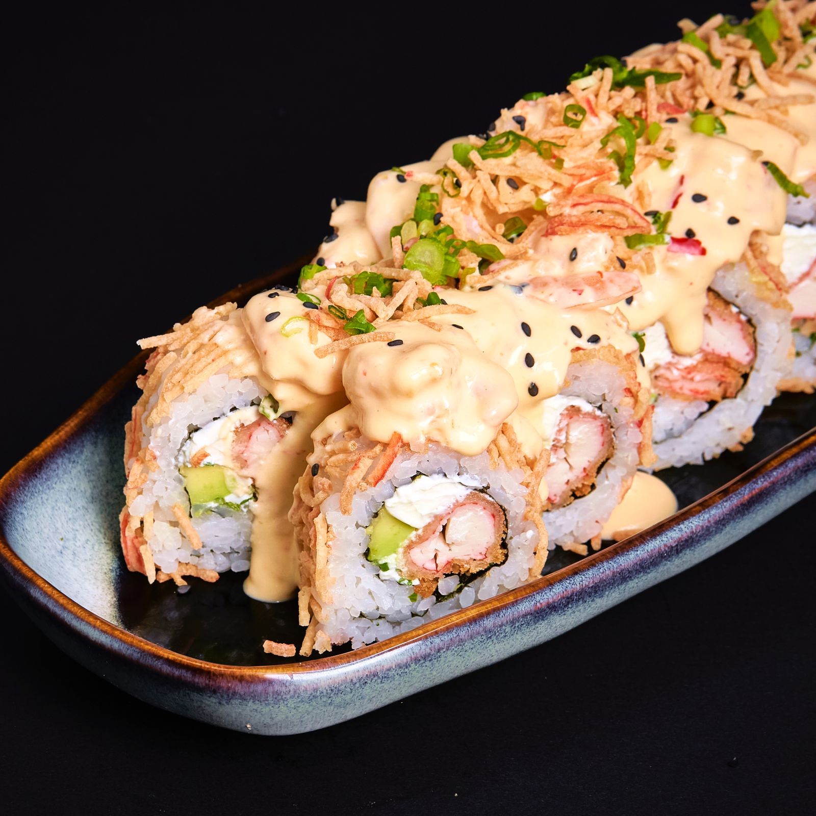 Pescado blanco tempura, queso Philadelphia, aguacate, con una corona de cangrejo en salsa mayo spicy.
