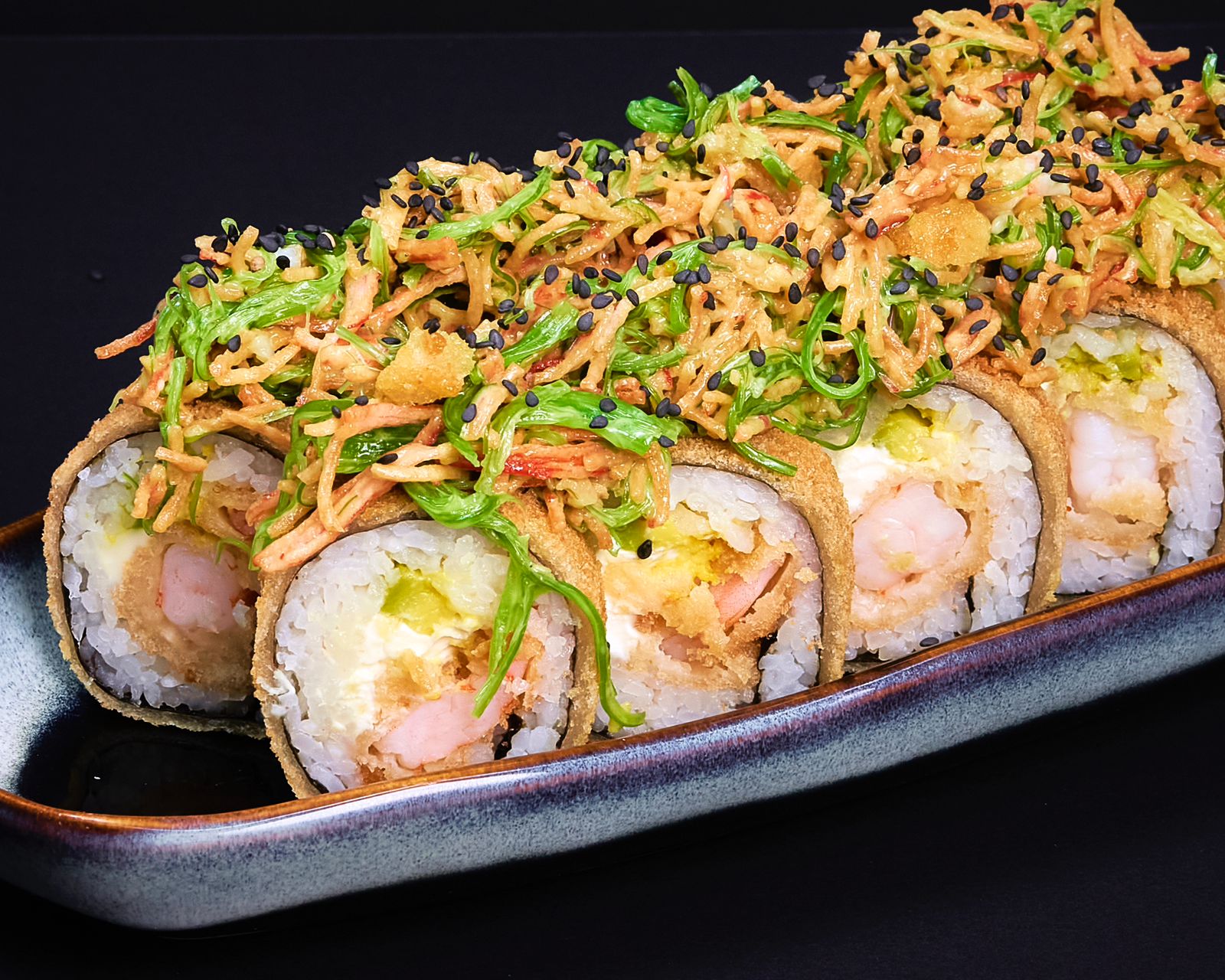 camarones tempurizados queso Philadelphia Aguacate, alga por fuera crocante , Topping de ensalada de cangrejo y wakame.