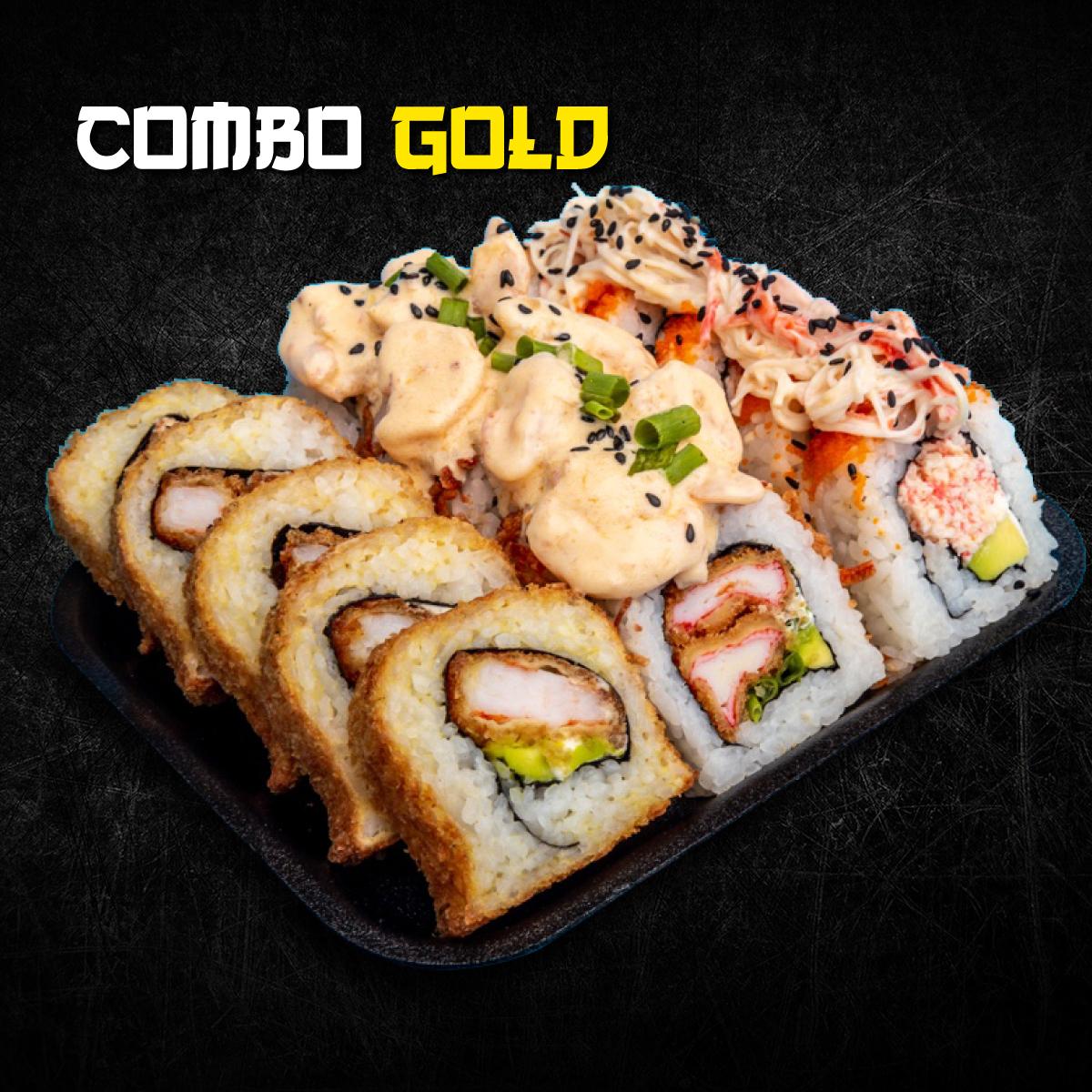 Salmón fresco, arroz de sushi, mango, aguacate, pepino, cebollitas crispy, zanahoria.