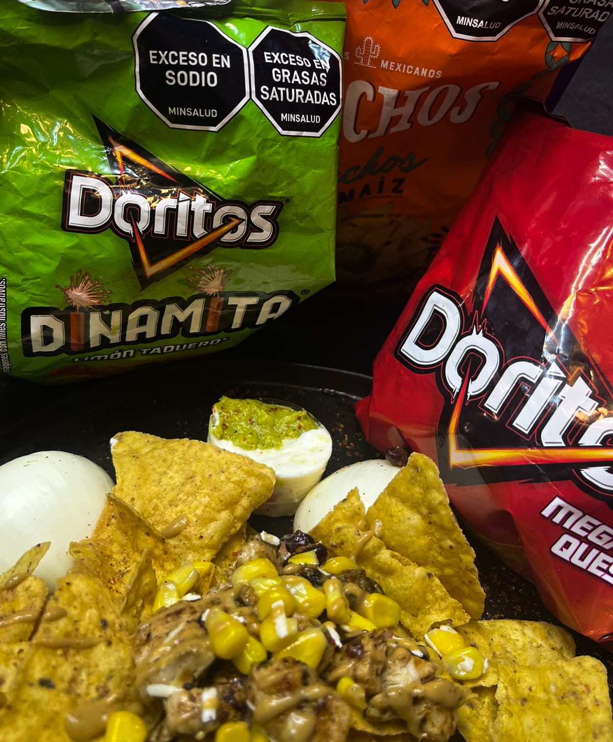 Una bolsa de Doritos clásicos, bañados en nuestra salsa especial de chipotle picante, rellenos de pollo troceado, lechuga, maíz, queso costeño, pico de gallo.