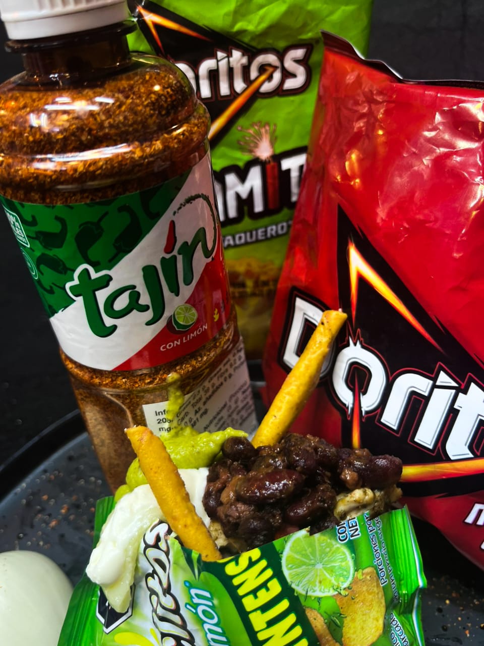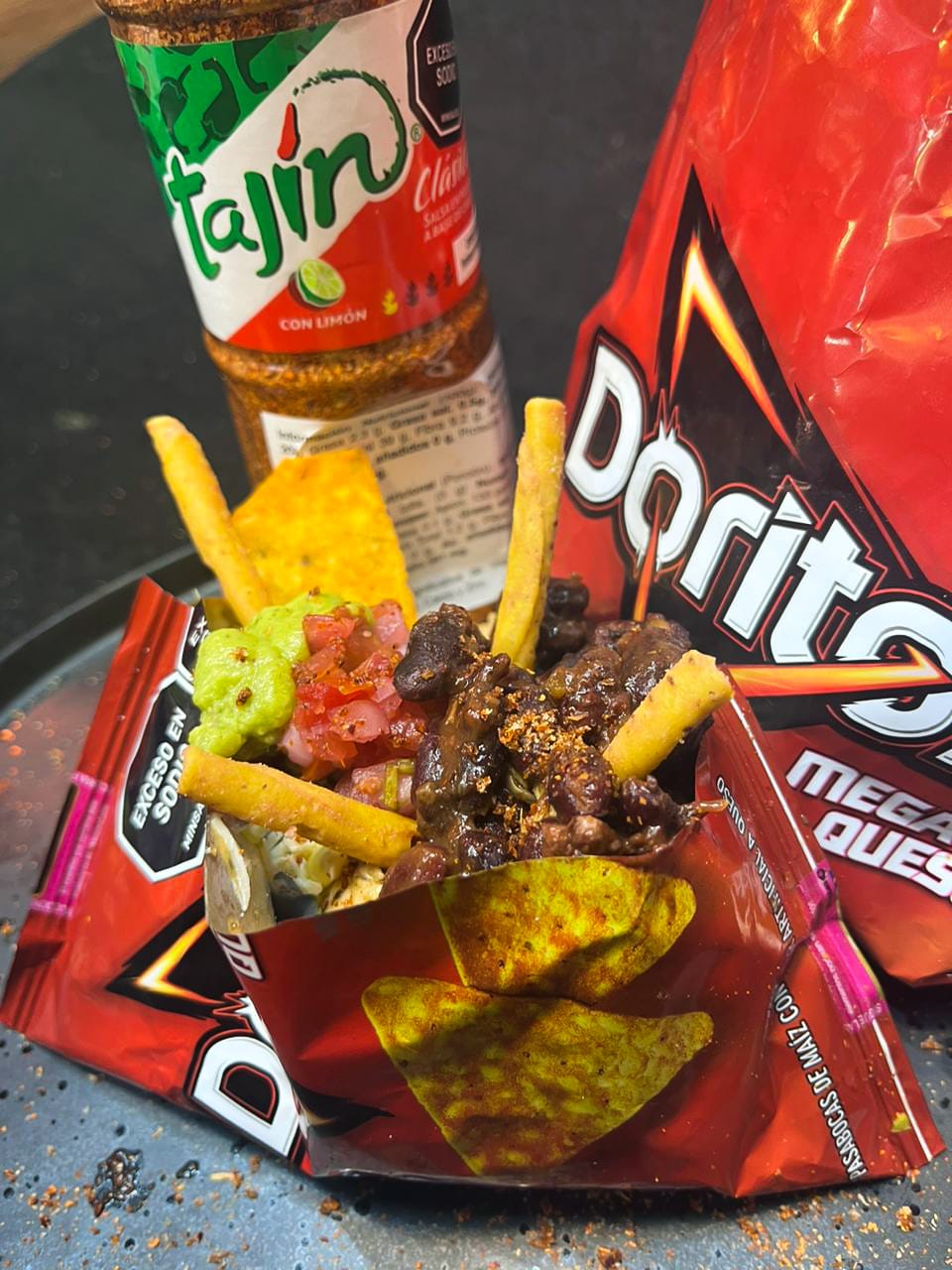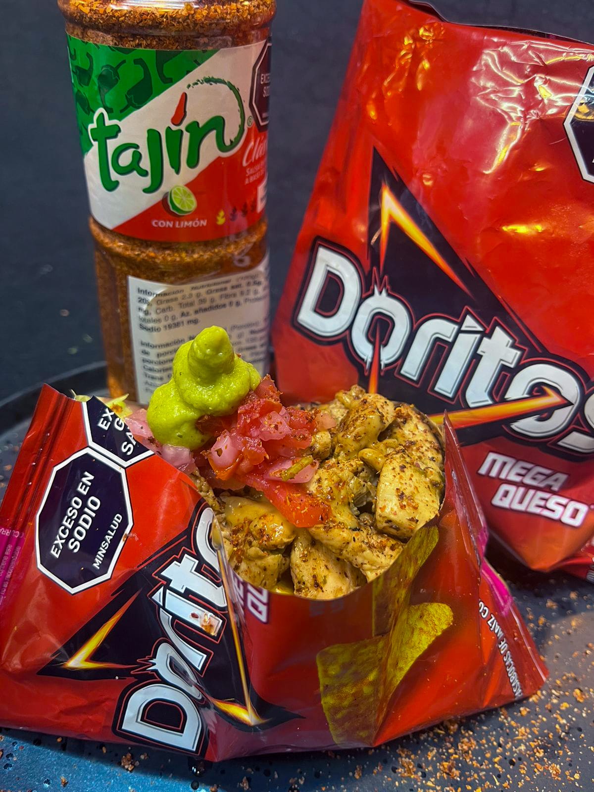 Una bolsa de Doritos clásicos, bañados en nuestra salsa especial de chipotle picante, relleno de chile y carne molida, lechuga, maíz, queso costeño, pico de gallo y guacamole, espolvoreado con delicioso Tajín