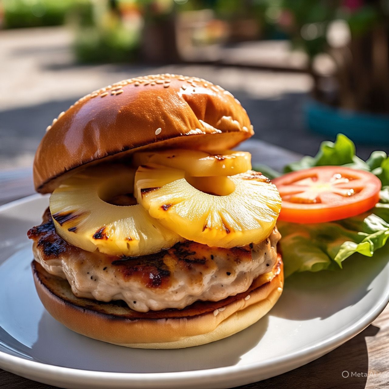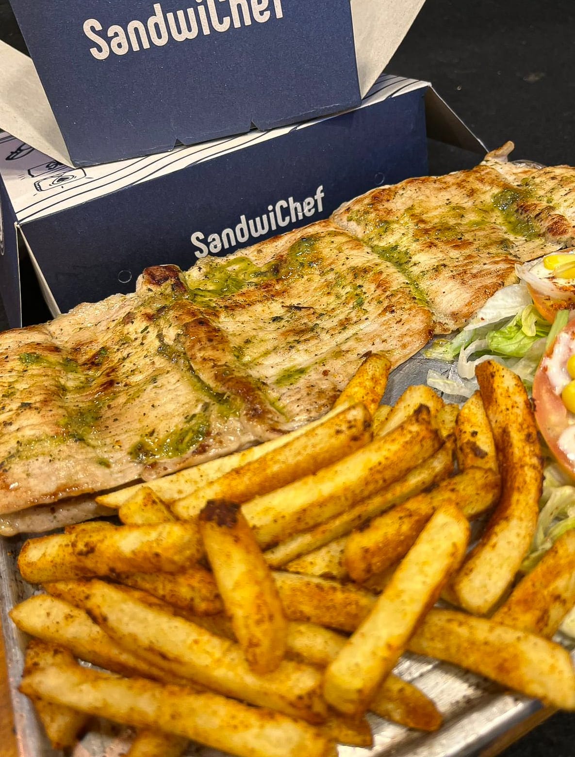 Dos Deliciosos panes artellano, acompañandos de pechuga de pollo en chinichurri mexicano picante, vegetales frescos y trozos de piña