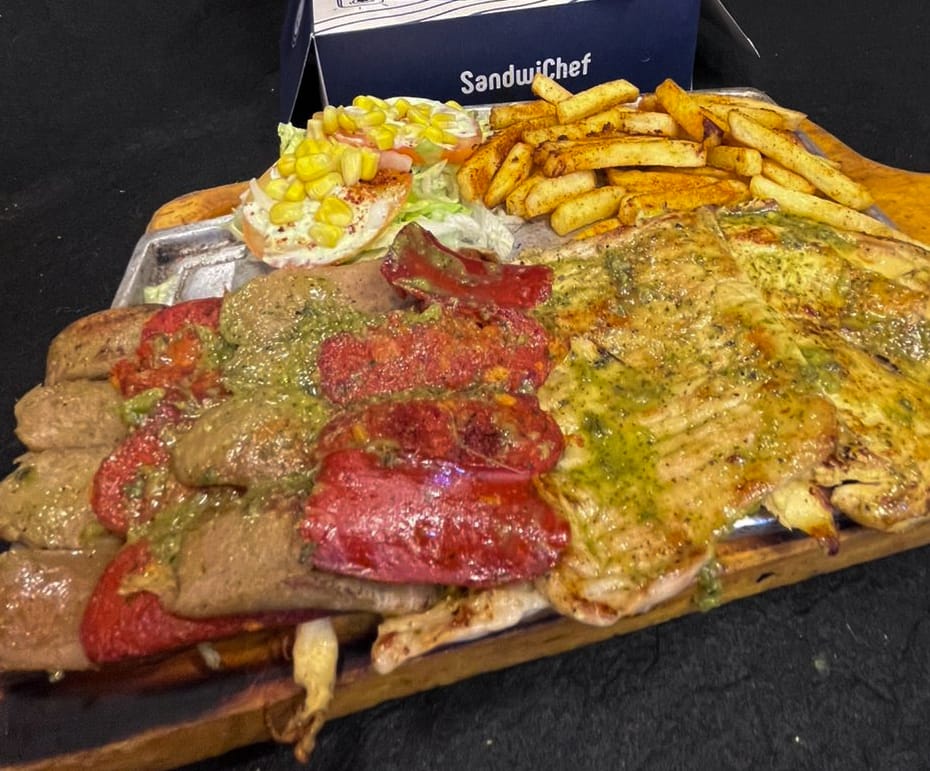 70 gr de pura pechuga de pollo,70 gr de pulpa de cerdo,1 chorizo en mariposa y una butifarra picante en mariposa hecha en grill de carbón con chimichurri especial mexicano, acompañados de papas francesas, bollo o croquetas de yuca.ensalada fresca de tomate,lechuga y maiz.