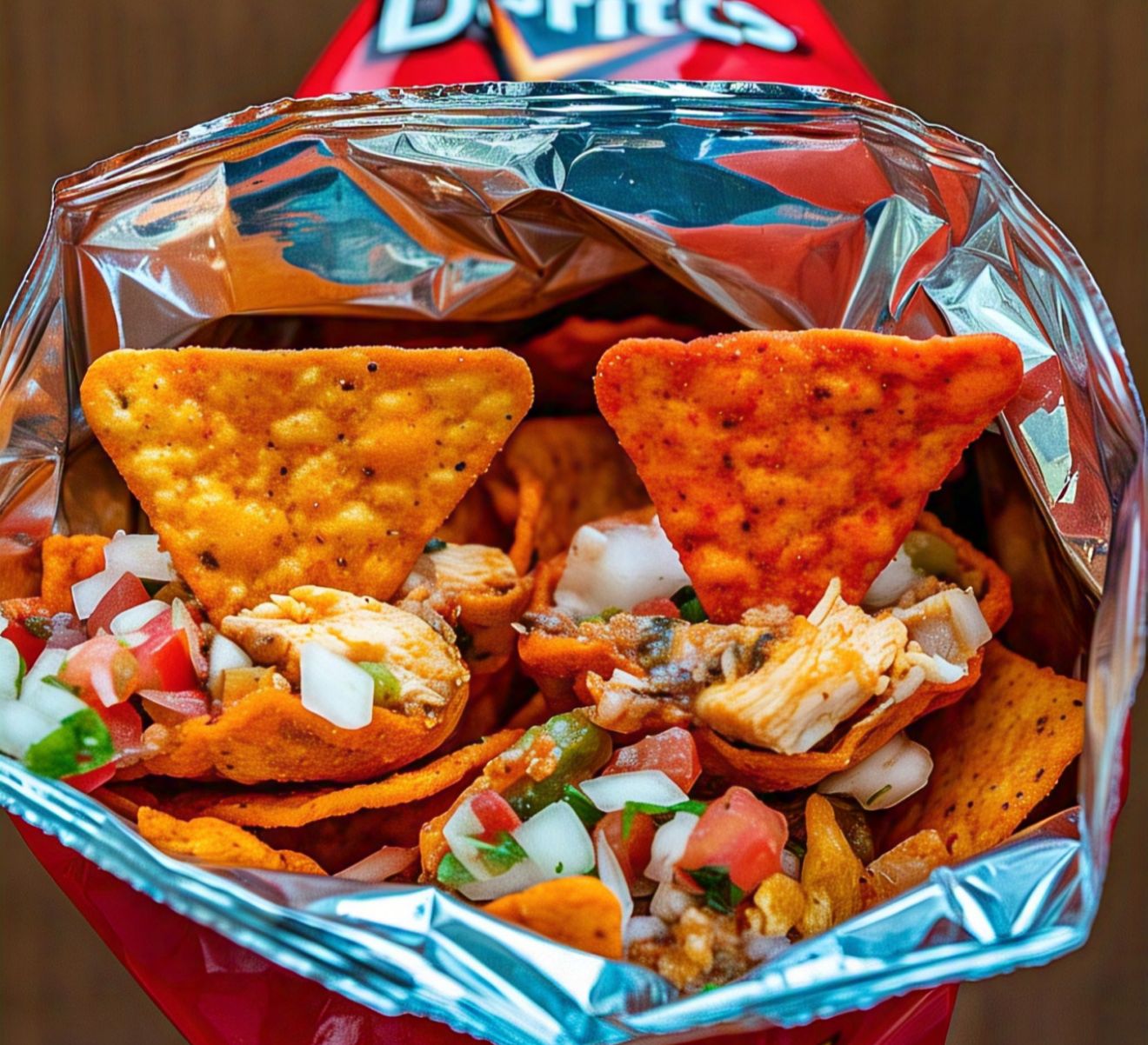 Una bolsa de Doritos clásicos, bañados en nuestra salsa especial de chipotle picante, rellenos de pollo troceado, lechuga, maíz, queso costeño, pico de gallo y guacamole.