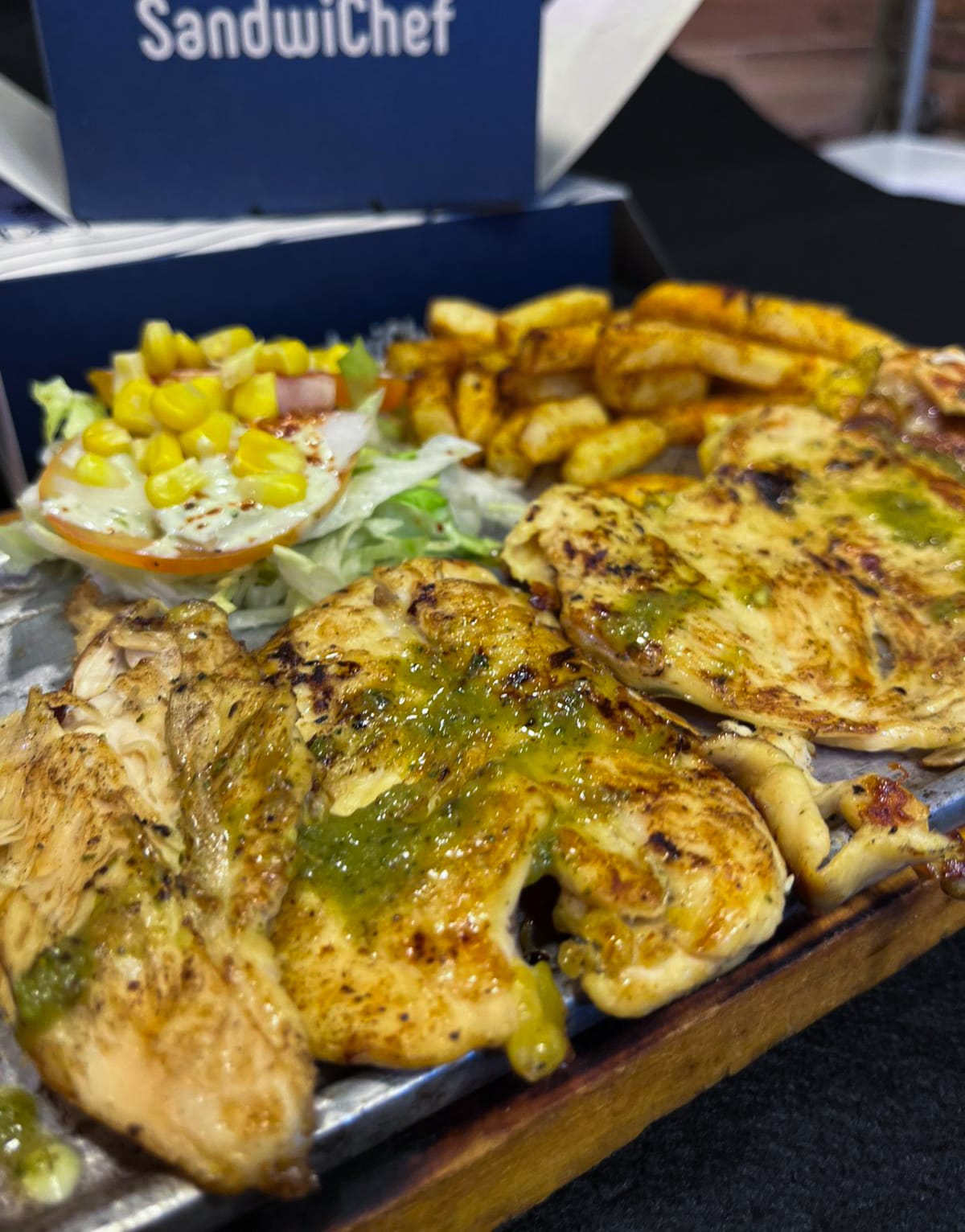 150gr de pura pechuga de pollo, hecha en grill de carbón con chimichurri especial mexicano, acompañados de papas francesas, bollo o croquetas de yuca.ensalada fresca de tomate,lechuga y maiz.